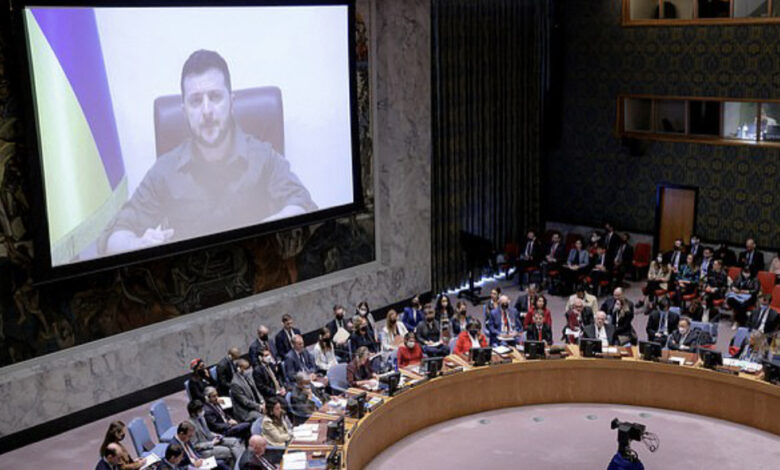 Ο Ουκρανός πρόεδρος ζήτησε επίσης να αποπεμφθεί η Ρωσία από το Συμβούλιο Ασφαλείας, του οποίου είναι ένα από τα πέντε μόνιμα μέλη, καθώς και να μεταρρυθμιστεί το σύστημα του Οργανισμού, ώστε «το δικαίωμα στο βέτο να μη σημαίνει δικαίωμα στον θάνατο».