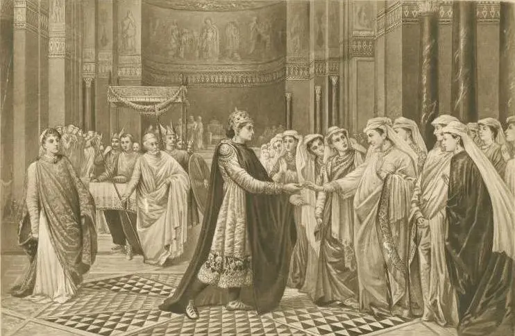 Στο παλάτι: αριστερά η μητριά, ο Θεόφιλος στο κέντρο και δεξιά οι υποψήφιες νύφες.