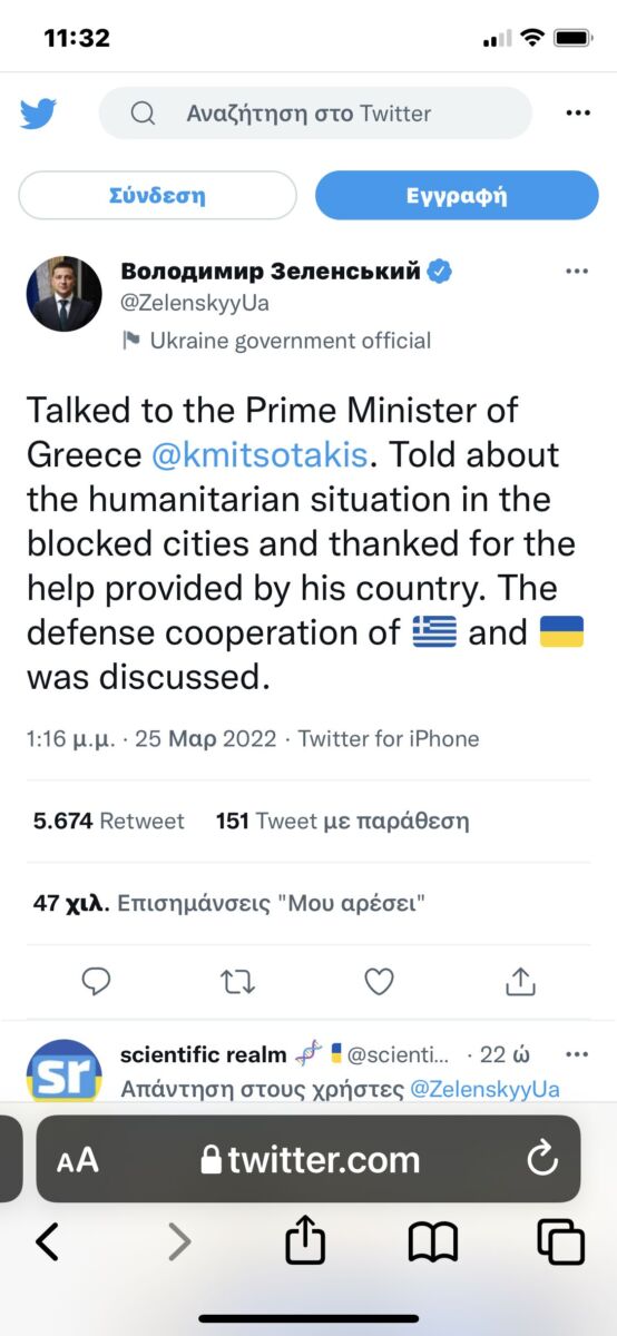 Αξίζει να σημειωθεί ότι ο Κυριάκος Μητσοτάκης είχε το μεσημέρι της Παρασκευής 25.3 νέα τηλεφωνική επικοινωνία με τον πρόεδρο της Ουκρανίας Βολοντίμιρ Ζελένσκι.