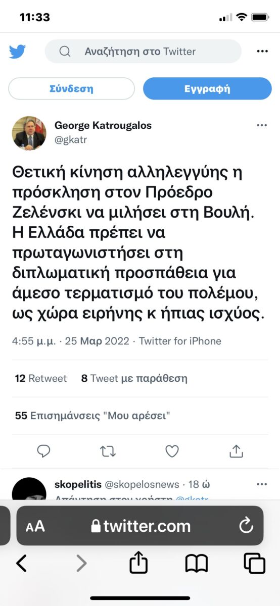Ο ΣΥΡΙΖΑ διά του Γ. Κατρούγκαλου έχει χαρακτηρίσει ως «θετική κίνηση αλληλεγγύης» την πρόσκληση στον πρόεδρο Ζελένσκι να μιλήσει στη Βουλή. «Η Ελλάδα πρέπει να πρωταγωνιστήσει στη διπλωματική προσπάθεια για άμεσο τερματισμό του πολέμου, ως χώρα ειρήνης και ήπιας ισχύος», ανέφερε ο Γιώργος Κατρούγκαλος με ανάρτησή του στο Twitter.