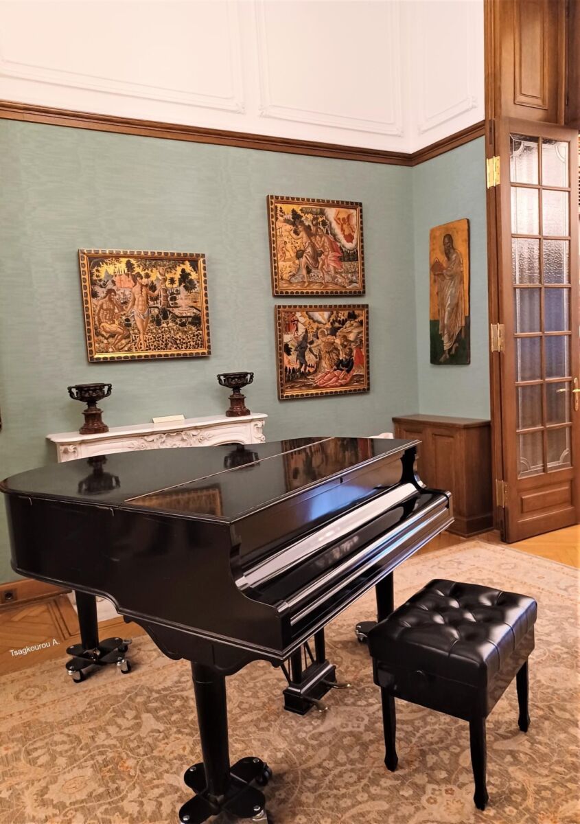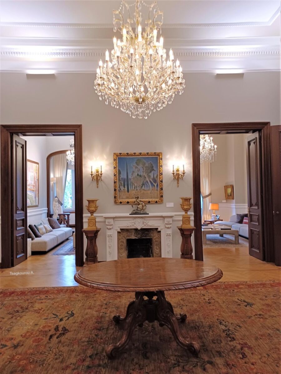 Η κυρίως πρόσοψη επί της Αμαλίας και οι χώροι υποδοχής στον πρώτο όροφο, που είχαν πολλά υποφέρει από παλαιότερες παραμορφωτικές επισκευές, αποκαταστάθηκαν με μεγάλη πιστότητα στα επί μέρους αρχιτεκτονικά και διακοσμητικά στοιχεία της αρχικής κατασκευής. Αποκαλύφθηκαν οι κρυμμένες από νεώτερες κατασκευές μαρμάρινες κολώνες της κεντρικής αίθουσας, συντηρήθηκαν οι περίτεχνες μαρμάρινες εστίες, έργα του μεγάλου γλύπτη Γιαννούλη Χαλεπά, και αποκαταστήθηκαν τα ξύλινα δάπεδα. Οι αίθουσες υποδοχής, όπως και το υπόλοιπο κτίριο επιπλώθηκαν και διακοσμήθηκαν με έπιπλα και έργα τέχνης που ανήκαν στον Αριστοτέλη Ωνάση και προέρχονται από τη θαλαμηγό «Χριστίνα». Ανάμεσά τους το πιάνο, το οποίο χρησιμοποιούσε η Μαρία Κάλλας όταν βρισκόταν στο πλοίο, καθώς και έπιπλα αντίκες και διακοσμητικά αντικείμενα.