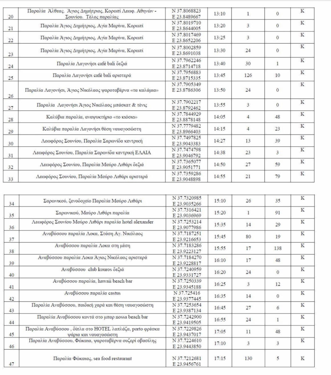 Δείτε εδώ τους πίνακες με τις αναλυτικές μετρήσεις για τις παραλίες από τον Πειραιά μέχρι τη Βουλιαγμένη και εδώ τους πίνακες για τις παραλίες από τη Βουλιαγμένη μέχρι την Παλαιά Φώκαια.