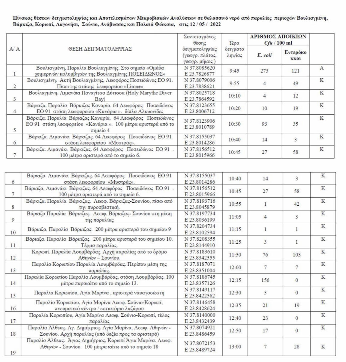 Από τα αποτελέσματα για τις παραλίες από τον Πειραιά μέχρι τη Βουλιαγμένη, διαπιστώνεται ότι στο 26% είναι ακατάλληλα τα νερά για κολύμβηση (δηλ. 13 στις 50 παραλίες) και στο 74% είναι κατάλληλα για κολύμβηση (δηλ. 37 παραλίες). Στους πίνακες με τις παραλίες από τη Βουλιαγμένη μέχρι την Παλαιά Φώκαια, διαπιστώνεται ότι στο 2% είναι ακατάλληλα τα νερά για κολύμβηση (δηλ. 1 στις 48 παραλίες) και στο 98% είναι κατάλληλα για κολύμβηση (δηλ. 47 παραλίες).