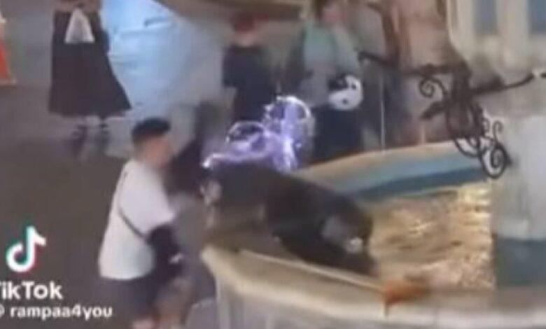Σε βίντεο που κυκλοφόρησε ευρέως, ένας νεαρός άνδρας φαίνεται να σπρώχνει βίαια έναν άστεγο, ο οποίος καθόταν ήρεμα στην άκρη του συντριβανιού, με αποτέλεσμα να τον ρίξει μέσα στο νερό.