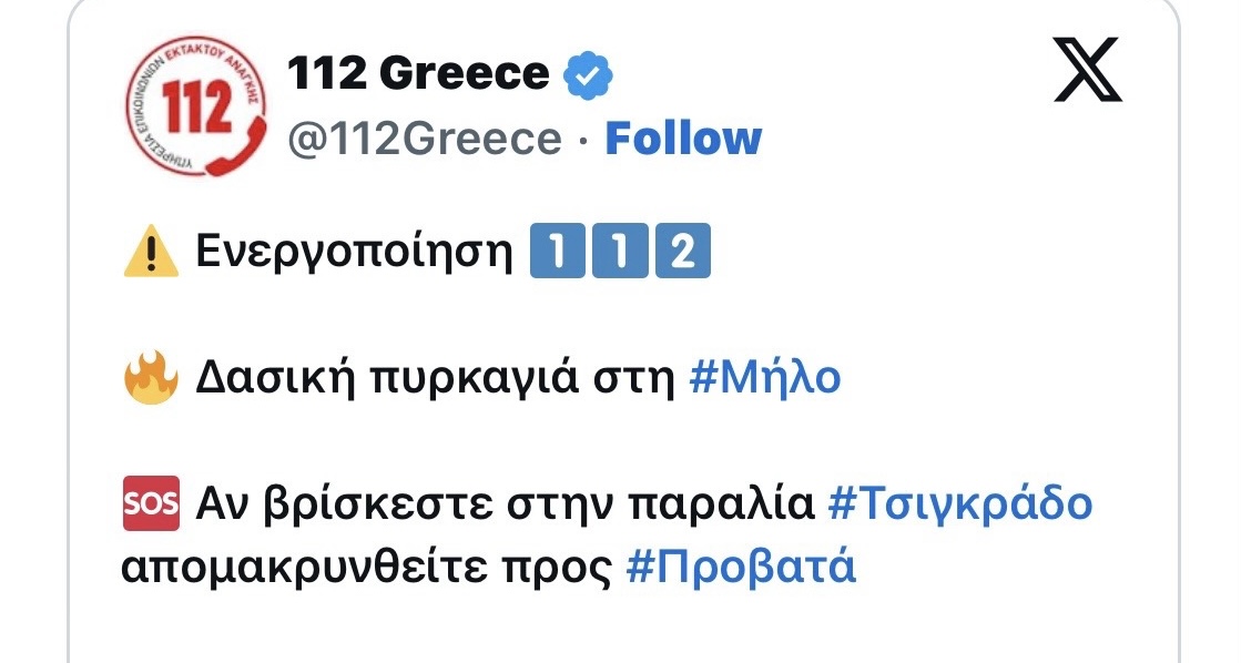 «Αν βρίσκεστε στην παραλία Τσιγκράδο απομακρυνθείτε προς Προβατά», ανέφερε το μήνυμα του «112».