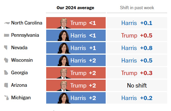 Η Αντιπρόεδρος Χάρις διατήρησε τη θέση της σε εθνικό επίπεδο και στο Μίσιγκαν, το Ουισκόνσιν και τη Νεβάδα, αλλά το προβάδισμά της στην Πενσυλβάνια συρρικνώθηκε την περασμένη εβδομάδα. Ο Ντόναλντ Τραμπ εξακολουθεί να ηγείται στην Αριζόνα, τη Τζόρτζια και τη Βόρεια Καρολίνα.
