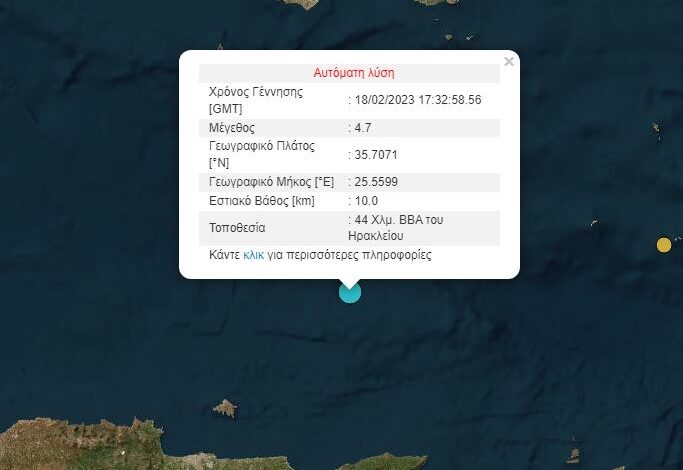 Σεισμος μεγέθους 4,7 βαθμών της κλίμακας Ρίχτερ έγινε σήμερα το απόγευμα στην Κρήτη.