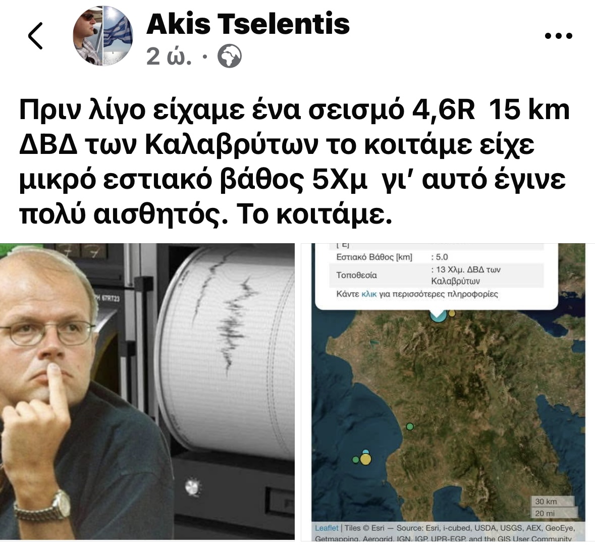 «Πριν λίγο είχαμε έναν σεισμό 4,6R 15 km ΔΒΔ των Καλαβρύτων. Το κοιτάμε. Είχε μικρό εστιακό βάθος 5 km, γι’ αυτό έγινε πολύ αισθητός».
