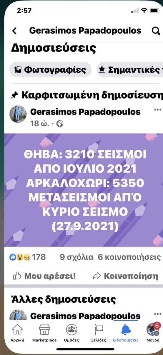 Όπως ανέφερε χαρακτηριστικά ο Γεράσιμος Παπαδόπουλος σε ανάρτησή του (στα social media) ,στην οποία σημείωνε ότι στη Θήβαέχουν σημειωθεί 3.210 σεισμοί από τον Ιούλιο του 2021 ενώ στο Αρκαλοχώρι έχουν σημειωθεί 5.350 μετασεισμοί μετά τον κύριο σεισμό της 27ης Σεπτεμβρίου 2021, αυτό σημαίνει για το Αρκαλοχώρι «φυσιολογική μετασεισμική εξέλιξη» ενώ για τη Θήβα «επικίνδυνη ίσως προσεισμική φάση»