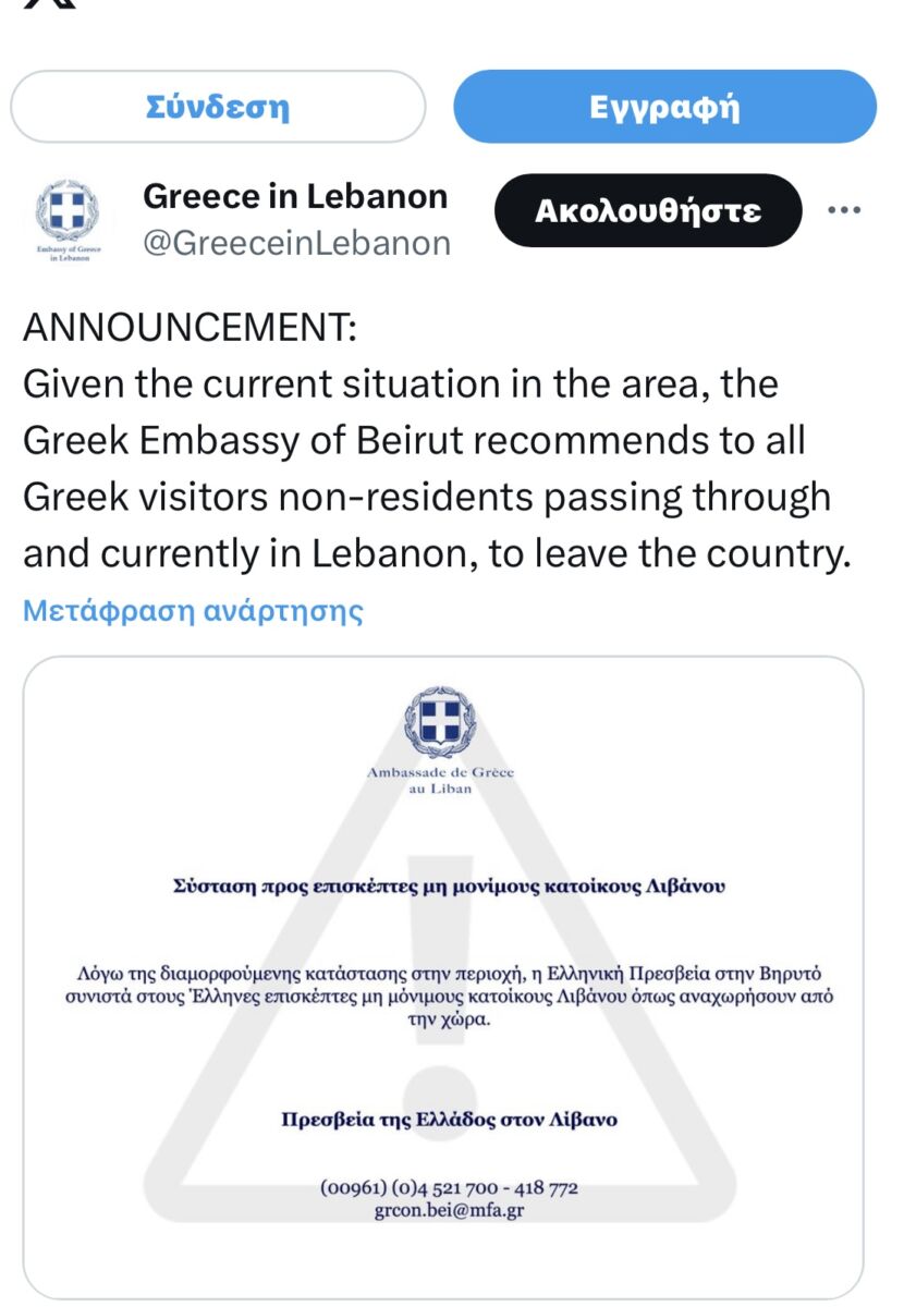«Λόγω της διαμορφούμενης κατάστασης στην περιοχή, η Ελληνική Πρεσβεία στην Βηρυτό συνιστά στους έλληνες επισκέπτες μη μόνιμους κατοίκους Λιβάνου όπως αναχωρήσουν από τη χώρα».