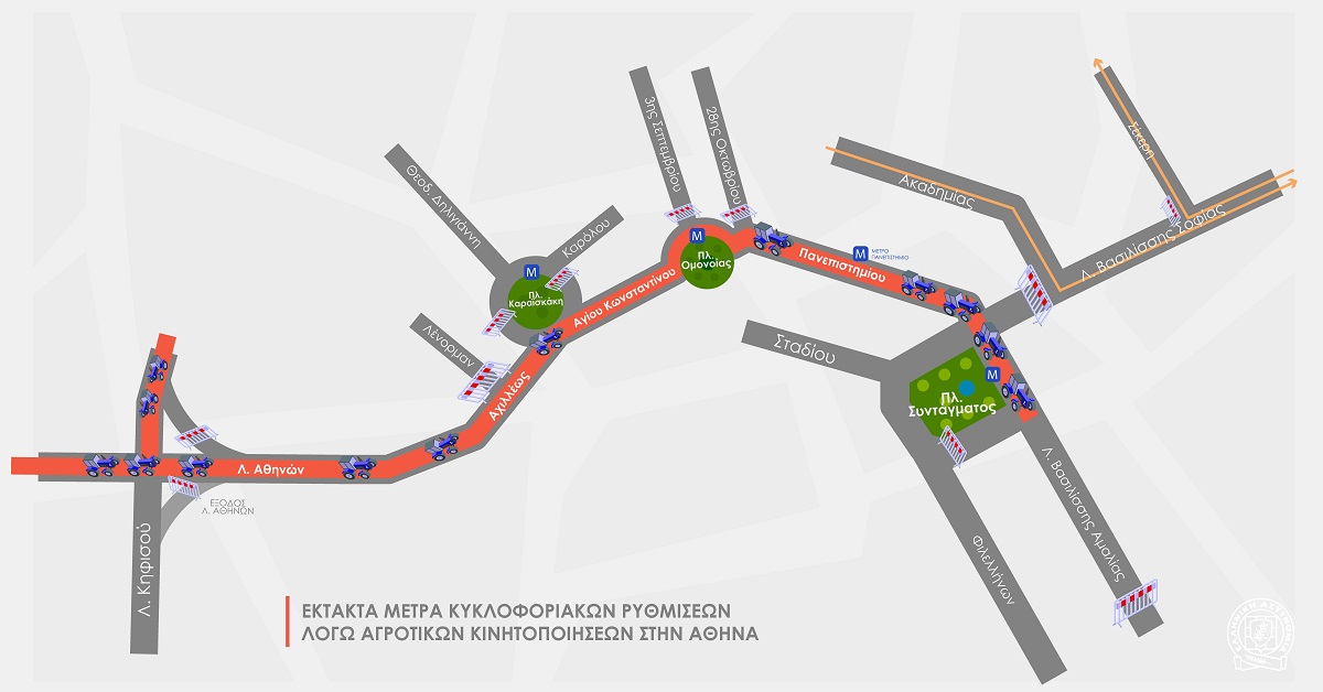 Σύμφωνα με τον επικεφαλής του Θαλάμου Επιχειρήσεων Παρακολούθησης και Ελέγχου Κυκλοφορίας, Αστυνομικό Υποδιευθυντή Θεοφάνη Αναγνώστου, θα γίνει προσωρινή διακοπή της κυκλοφορίας κατά μήκος του δρομολογίου που θα ακολουθήσουν τα αγροτικά οχήματα: