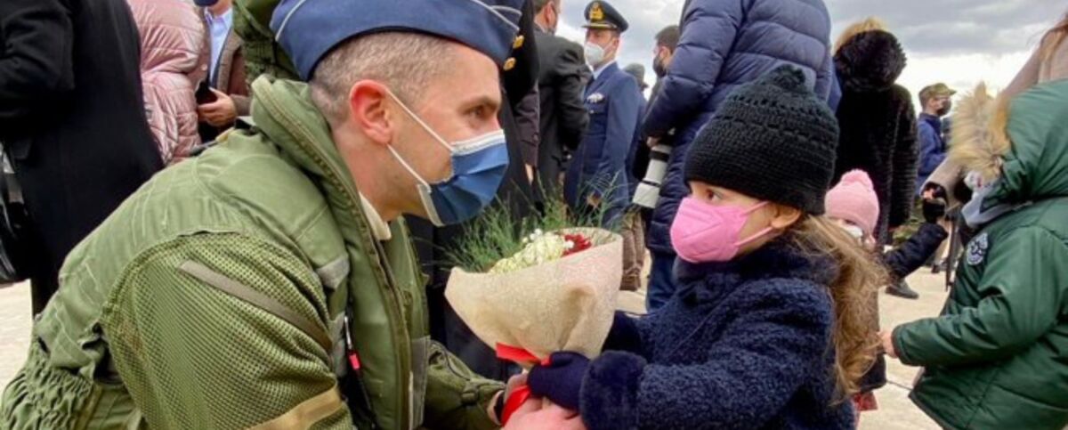 Μια χαριτωμένη μικρούλα υποδέχεται τον πιλότο πατερα της αφού πρώτα «φώναξε ο μπαμπάς μου είναι εκεί ….» Δείχνοντας τα Rafale .