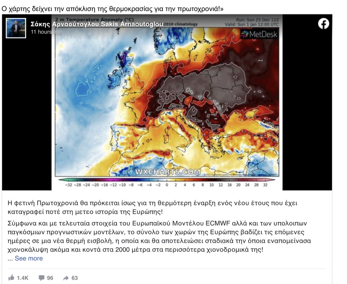 Ο γνωστός μετεωρολόγος επισημαίνει ότι φέτος η Πρωτοχρονιά θα είναι η θερμότερη που έχει καταγραφεί ποτέ στην ιστορία της Ευρώπης, εξηγώντας ότι αυτό θα συμβεί και σε πολλές άλλες χώρες της Ευρώπης.