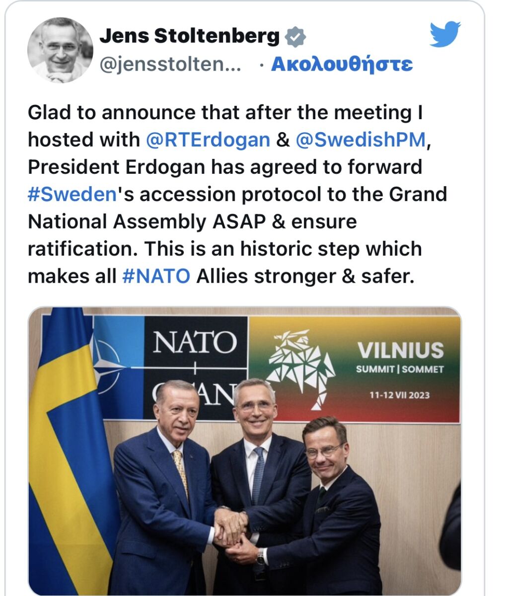 Η Τουρκία σύμφωνα με tweet του Γενς Στολτενμπεργκ δέχθηκε να προχωρήσουν οι διαδικασίες για την ένταξη της Σουηδιας στο ΝΑΤΟ .Ο γενικός γραμματέας της Βορειοατλαντικής Συμμαχίας, κάνει λόγο για ιστορική ημέρα.