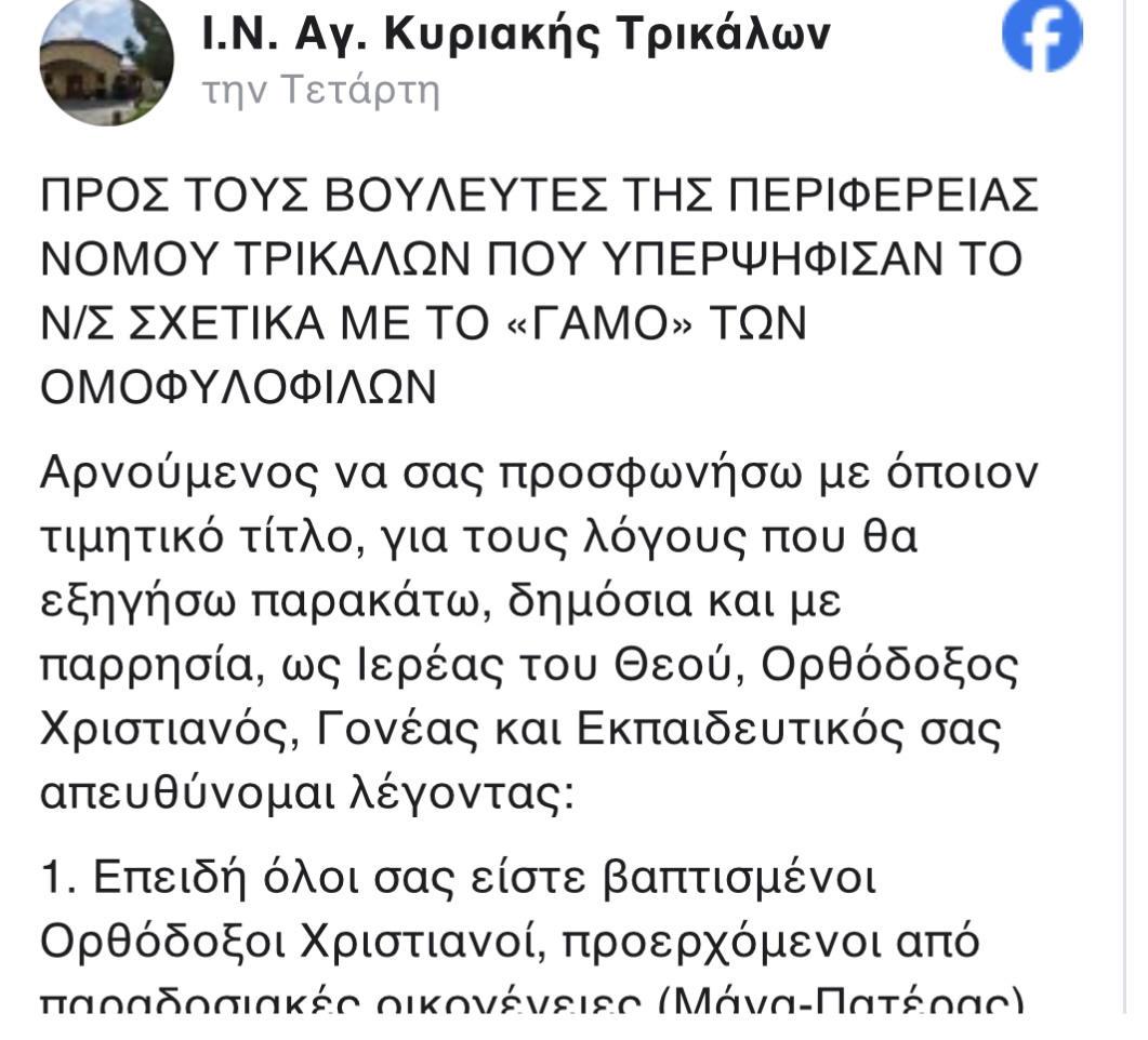 Ανεπιθύμητους κυρηξε ο Ιερεύς της εκκλησίας της Αγίας Κυριακής Τρικάλων τους βουλευτές που ψήφισαν υπέρ του νομοσχεδίου για τα ομόφυλα ζευγάρια.