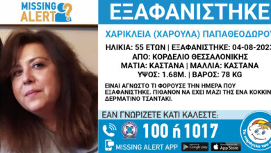 Εξαφανίστηκε την Παρασκευή 4 Αυγούστου, από την περιοχή του Κορδελιού Θεσσαλονίκης, η Παπαθεοδώρου Χαρίκλεια (Χαρούλα), 55 ετών. Το «Χαμόγελο του…