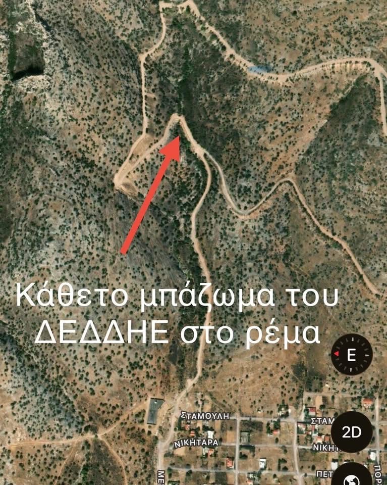 Για να κάνει το έργο υπογειοποίησης του δικτύου του ο ΔΕΔΔΗΕ τον περασμένο Μάιο στον Υμηττό πάνω από την οδό Μετσόβου στην πόλη μας, μπάζωσε και έκλεισε τη ρεματιά στο σημείο που δείχνουν οι φωτογραφίες, 850 μέτρα περίπου πάνω από την οδό Μετσόβου.