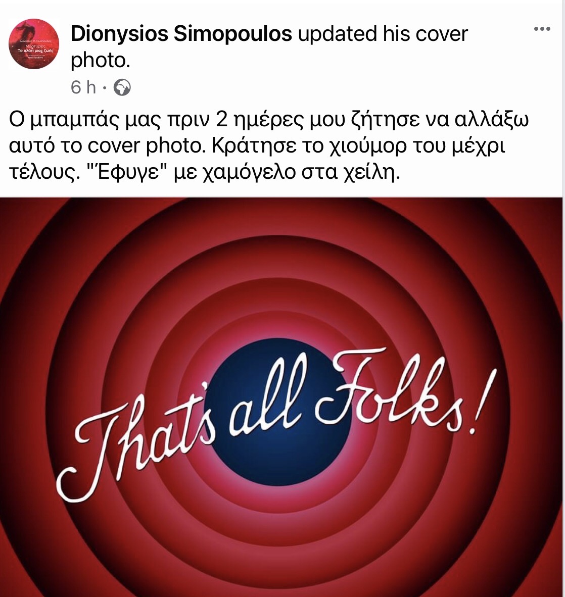 «Ο μπαμπάς μας πριν 2 ημέρες μου ζήτησε να αλλάξω αυτό το cover photo. Κράτησε το χιούμορ του μέχρι τέλους. “Έφυγε” με χαμόγελο στα χείλη», γράφει στην ανάρτηση με το νέο cover photo που ανέβασαν τα παιδιά του…