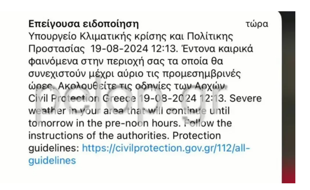 Συγκεκριμένα, σύμφωνα με το μήνυμα τις αμέσως προσεχείς ώρες αναμένεται να εκδηλωθούν έντονα καιρικά φαινόμενα που θα συνεχιστούν έως και το μεσημέρι της Τρίτης 20 Αυγούστου.