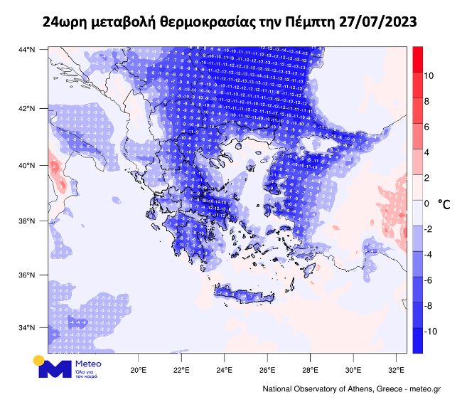 Ήδη από το βράδυ της Τετάρτης η πτώση της θερμοκρασίας έχει ξεκινήσει από τα βορειοδυτικά και οι μέγιστες τιμές θερμοκρασίας προβλέπεται να υποχωρήσουν σήμερα έως και 14 °C σε σχέση με τις αντίστοιχες τιμές της Τετάρτης 26/07.