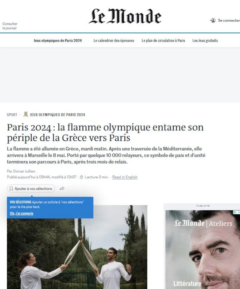 Με διθυραμβικούς τόνους η γαλλική εφημερίδα Le Monde έκανε αφιέρωμα με τίτλο «Παρίσι 2024: Στην Ολυμπία, η τελετή αφής της Ολυμπιακής Φλόγας γίνεται πλατφόρμα για την ειρήνη» φιλοξενώντας δηλώσεις Ελλήνων αξιωματούχων, αλλά και πολιτών, που αναφέρονται τόσο στον συμβολικό χαρακτήρα της τελετής, όσο και στην ελπίδα να μεταφέρει μηνύματα ειρήνης.