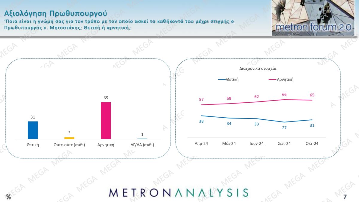 Στην αξιολόγηση του πρωθυπουργού το 31% έχει θετική άποψη ενώ το 65% αρνητική με ένα 3% να λέει ούτε θετική ούτε αρνητική.