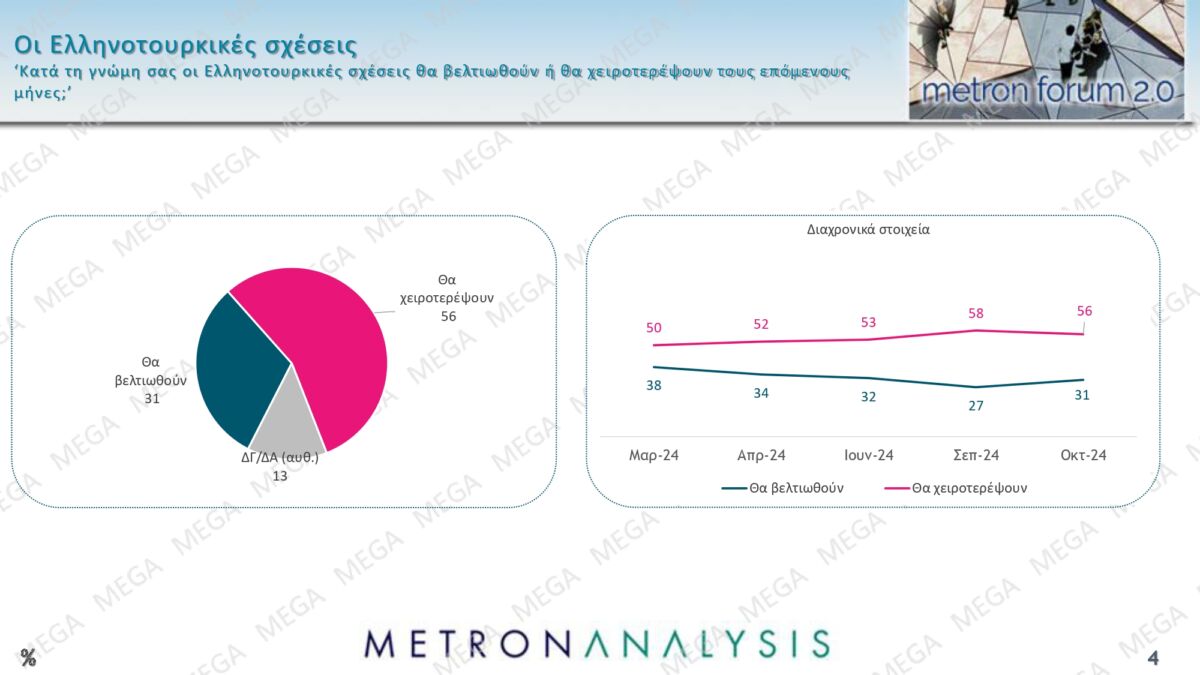 Για τις ελληνοτουρκικές σχέσεις το 56% θεωρεί πως θα χειροτερέψει ενώ το 31% πως θα βελτιωθούν με ένα 13% να μην απαντά.