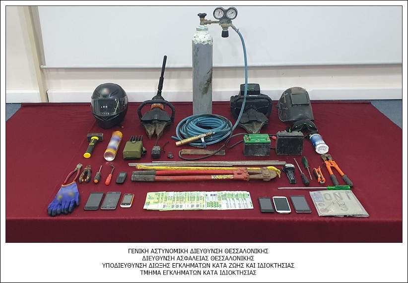 Η Ειδική ομάδα αστυνομικών του Τμήματος Εγκλημάτων κατά Ιδιοκτησίας της Διεύθυνσης Ασφάλειας Θεσσαλονίκης έπειτα από έρευνα και συντονισμένες ενέργειες πέτυχε την εξάρθρωση εγκληματικής οργάνωσης, που ενέχεται σε περιπτώσεις διαρρήξεων ΑΤΜ και οικιών στην ευρύτερη περιοχή της Θεσσαλονίκης.