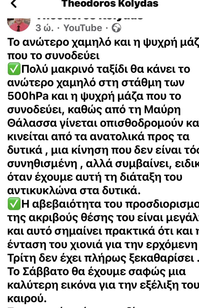 Ο μετεωρολόγος Θοδωρής Κολυδάς αναφέρθηκε με ανάρτησή του στο Facebook για την  επιδείνωση του καιρού σημειώνοντας ότι «η ένταση του χιονιά για την ερχόμενη Τρίτη δεν έχει πλήρως ξεκαθαρίσει». Σύμφωνα με τα τελευταία προγνωστικά στοιχεία αναμένεται ψυχρή εισβολή με χιόνια και τσουχτερό κρύο .
