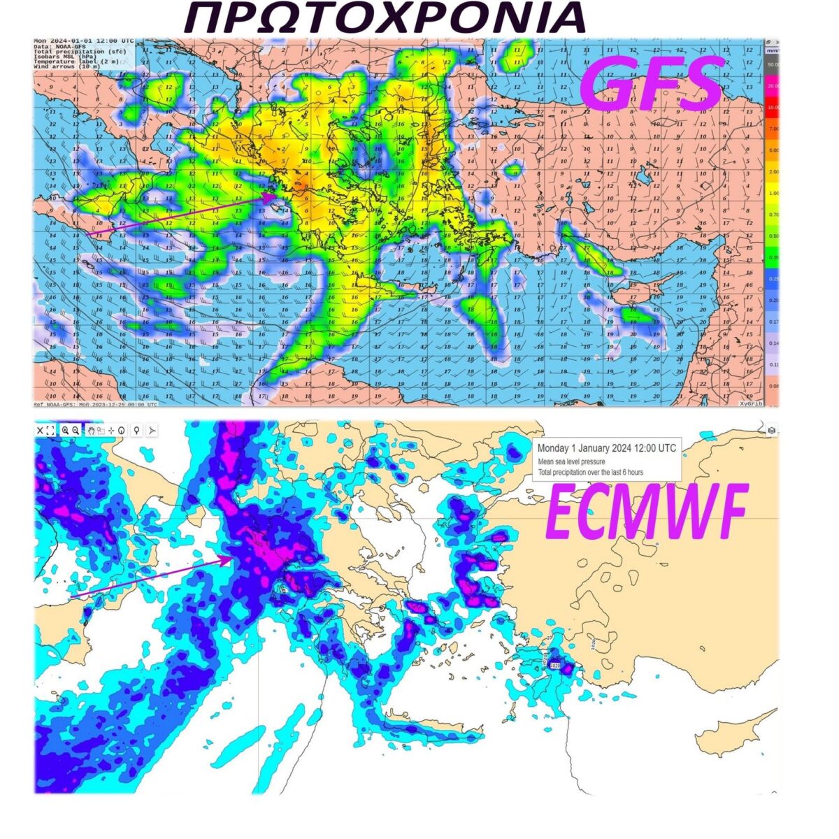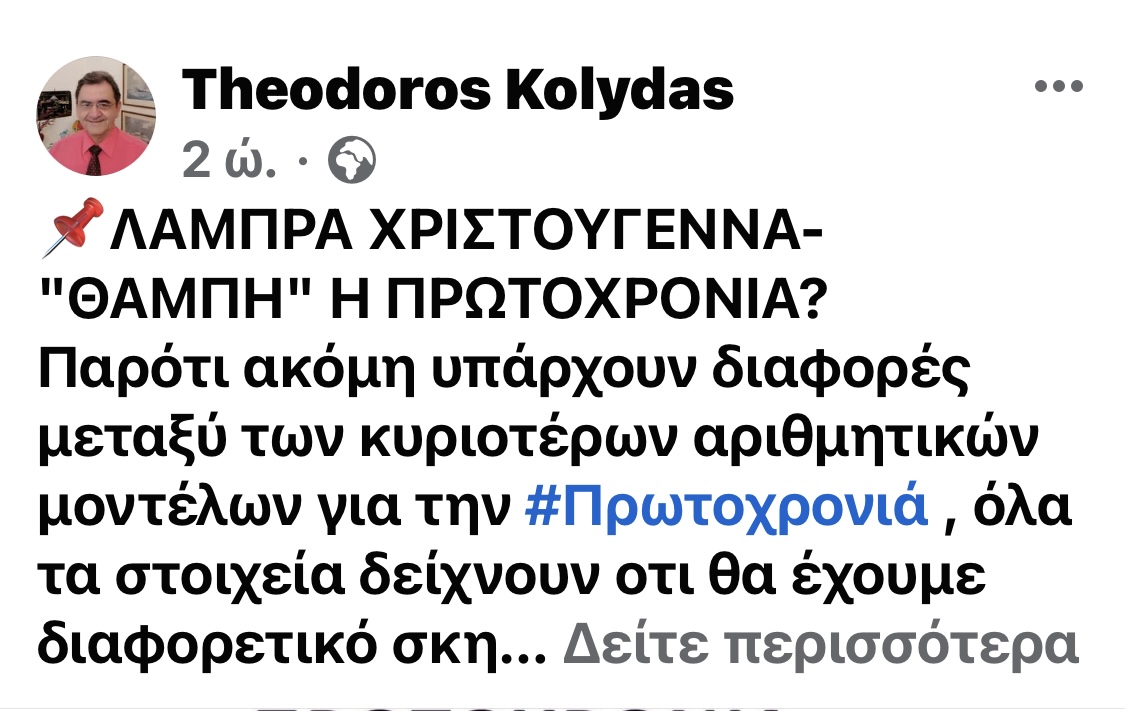 «Παρότι ακόμη υπάρχουν διαφορές μεταξύ των κυριοτέρων αριθμητικών μοντέλων για την Πρωτοχρονιά, όλα τα στοιχεία δείχνουν ότι θα έχουμε διαφορετικό σκηνικό του καιρού απ’ ότι τα Χριστούγεννα. Χαμηλό από την Ιταλία θα φέρει πολλές βροχές μετά την Πρωτοχρονιά».