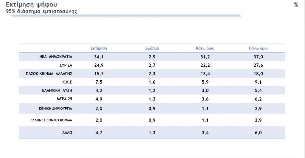Το ενδιαφέρον είναι ότι η ΝΔ στο κάτω όριο μπορεί να φτάσει το 31,2% ενώ στο πάνω όριο φτάνει το 37%, δηλαδή κοντά σε αυτοδυναμία.