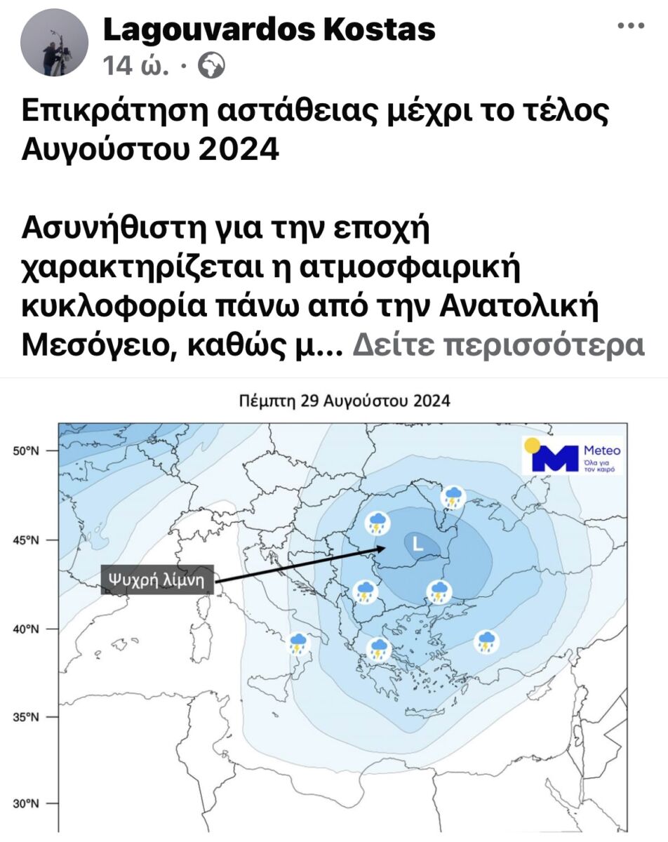 «Από την Πέμπτη 29/8 και τουλάχιστον μέχρι το Σάββατο 31/8 προβλέπεται ενίσχυση της αστάθειας, με καταιγίδες να επηρεάζουν μεγάλο μέρος της χώρας» σύμφωνα με τον Κώστα Λαγουβάρδο. Ο ίδιος συμπληρώνει σε ανάρτησή του στο Facebook ότι «θα είναι αυξημένος ο κίνδυνος πλημμυρικών φαινομένων, καθώς προβλέπεται μεγάλη ραγδαιότητα βροχοπτώσεων και μεγάλο αριθμό ηλεκτρικών εκκενώσεων. Η θερμοκρασία θα σημειώσει μικρή πτώση στα ηπειρωτικά και θα κυμανθεί κοντά στα φυσιολογικά για την εποχή επίπεδα».