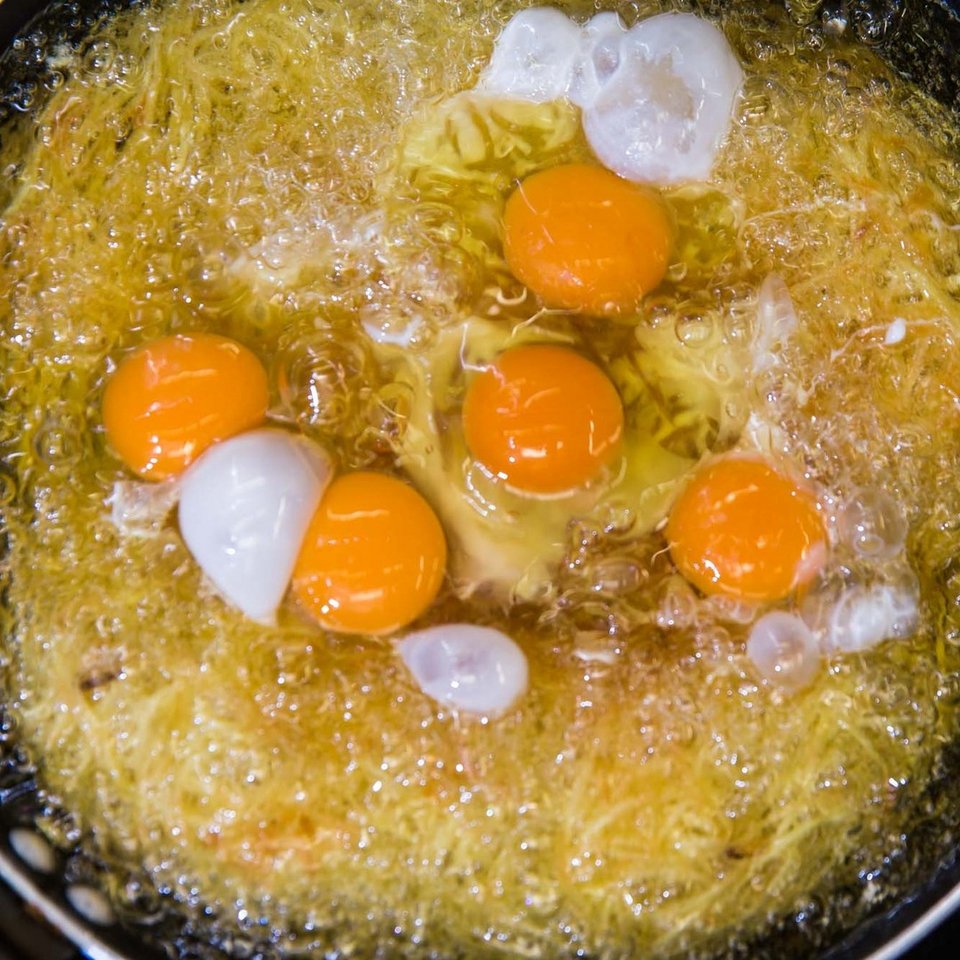Η πασίγνωστη φωλια που αποτελείται από λεπτοκομμένες πατάτες πλεγμένες σαν φωλιά, τηγανισμένες με αυγά τηγανιτά!