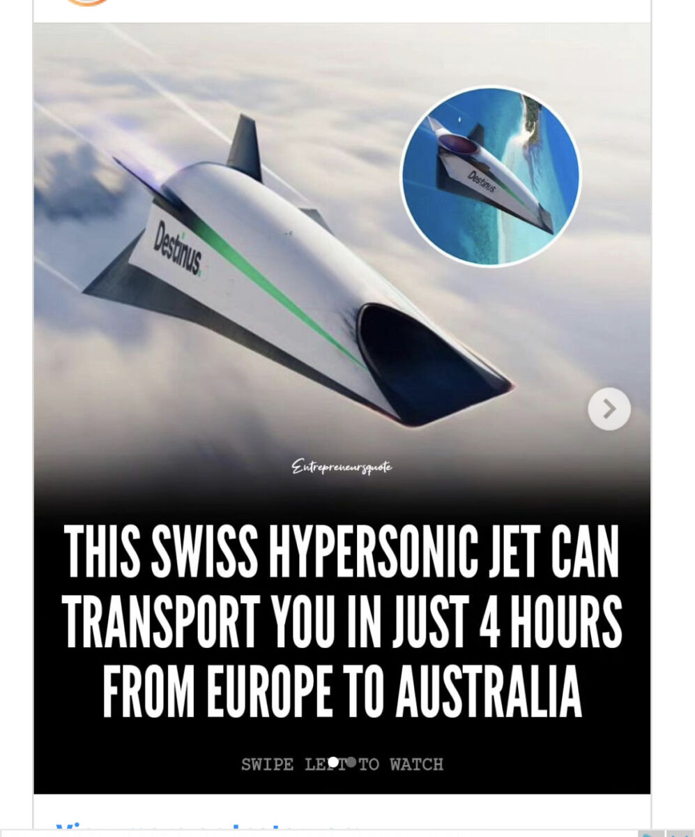 Μια απευθείας πτήση από την Ευρώπη στην Αυστραλία διαρκεί περίπου 20 ώρες. Υπάρχει μια ελβετική start-up εταιρεία, όμως, που θέλει να αλλάξει τα δεδομένα, δημιουργώντας ένα υπερηχητικό τζετ που θα μειώσει το χρόνο της αεροπορικής διαδρομής σε μόλις τέσσερις ώρες. Σύμφωνα με το ρεπορτάζ του Euronews, η Destinus δοκιμάζει το πρωτότυπο αεροσκάφος τα τελευταία δύο χρόνια, με το τελευταίο επιτυχημένο τεστ να πραγματοποιείται στα τέλη του 2022.
