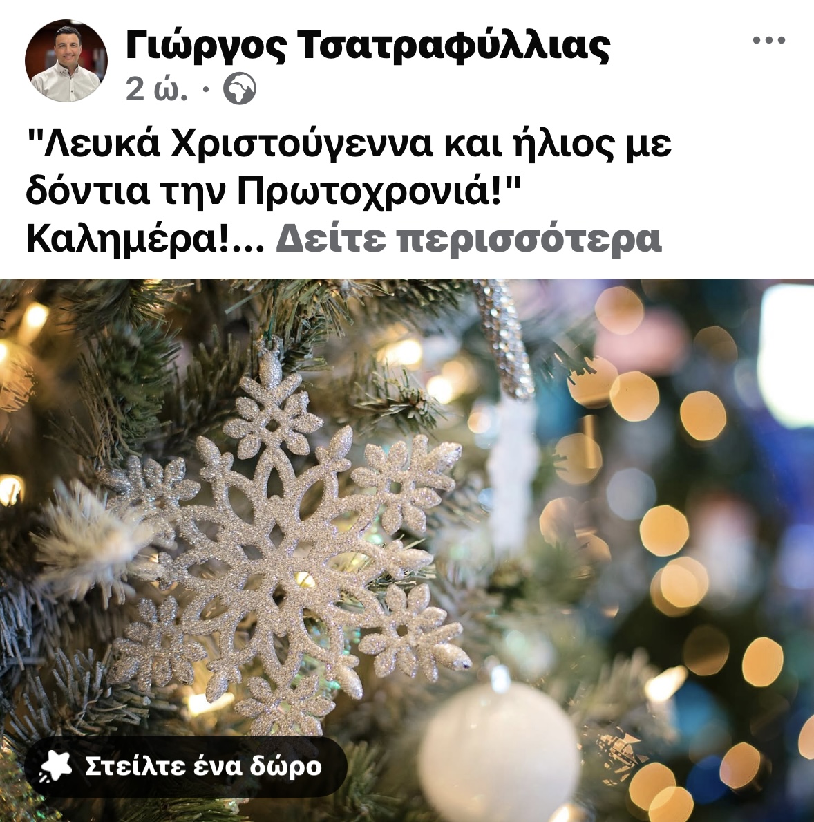 Με τη φράση «λευκά Χριστούγεννα και ήλιος με δόντια την Πρωτοχρονιά» ο Γιώργος Τσατραφύλλιας έκανε μια ανάρτηση στα social media για τον καιρό εστιάζοντας στα χιόνια και στις χαμηλές θερμοκρασίες.