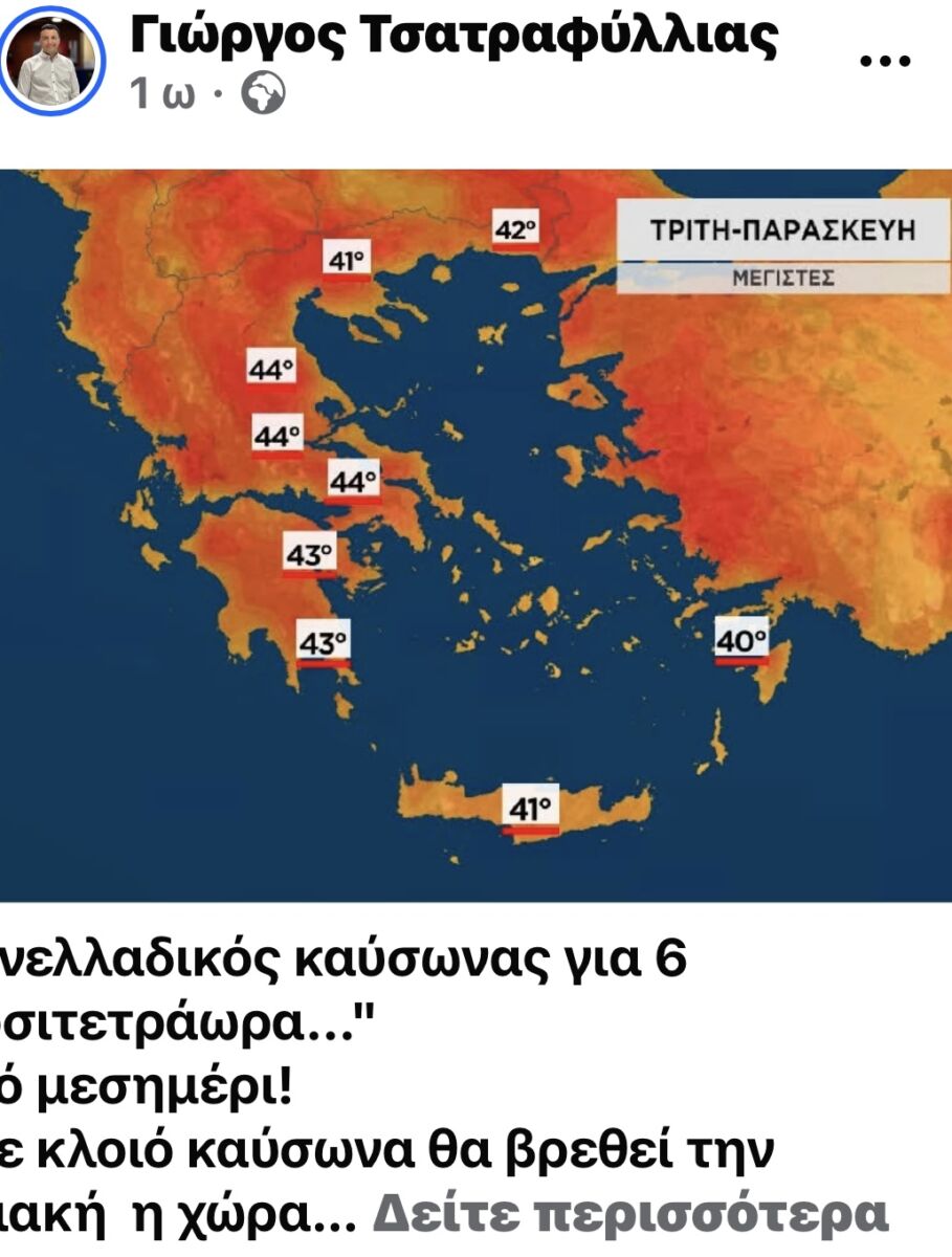 Τσατραφύλλιας :Έρχεται πανελλαδικός καύσωνας για έξι ημέρες -Έως και 45°C