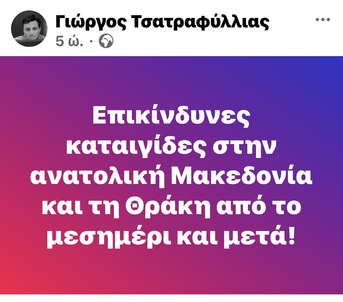 http://Με ανακοίνωση του στα social media ο μετεωρολόγος Γιώργος Τσατραφύλλιας έκανε λόγο για επικίνδυνα καιρικά φαινόμενα της επόμενες ώρες .Με ανακοίνωση του στα social media ο μετεωρολόγος Γιώργος Τσατραφύλλιας έκανε λόγο για επικίνδυνα καιρικά φαινόμενα της επόμενες ώρες .
