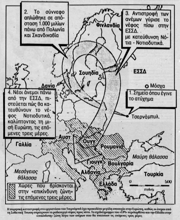 Στην Ελλάδα η είδηση έφτασε τρεις μέρες μετά το ατύχημα. Δημοσιεύματα άρχισαν να γράφουν ότι υπήρχε πιθανότητα να έρθει το ραδιενεργό νέφος στην Ελλάδα, αλλά “χωρίς κίνδυνο για τη δημόσια υγεία”.