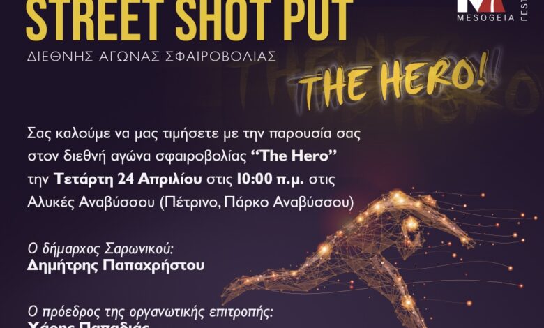 Το παγκόσμιας ακτινοβολίας μίτινγκ σφαιροβολίας THEHERO φιλοξενεί ο Δήμος Σαρωνικού την Τετάρτη 24 Απριλίου, στις Αλυκές Αναβύσσου. Πρόκειται για τον απόλυτα επιτυχημένο και με πανελλαδική πρωτοτυπία, αγώνα ρίψεων σε αστικό περιβάλλον, με πρωταγωνιστές τους κορυφαίους Έλληνες πρωταθλητές αλλά και πολύ σπουδαίους αθλητές από το εξωτερικό.